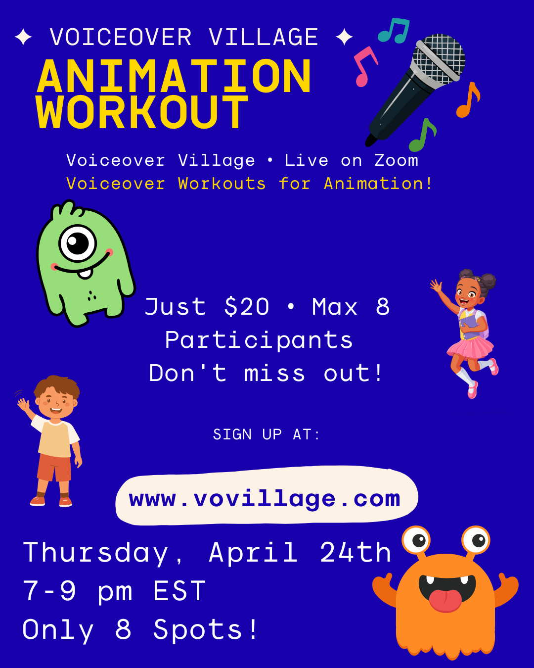 A small, hands‑on voiceover workout for animation. You will be on‑mic, getting reps and feedback — not watching from the sidelines.